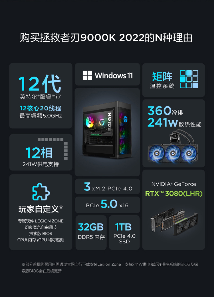 自營聯(lián)想(Lenovo)拯救者刃9000K 2022游戲電腦主機(12代酷睿i7-12700KF RTX3080 10GB LHR顯卡32G DDR5 側(cè)透 )