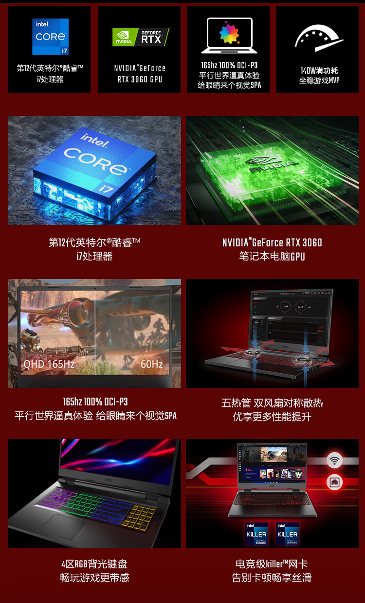商品名稱:宏碁 新暗影騎士·擎 15.6英寸2.5K屏游戲筆記本電腦(12代i7-12700H 16G 512G RTX3060滿血 165Hz 100%DCI-P3)