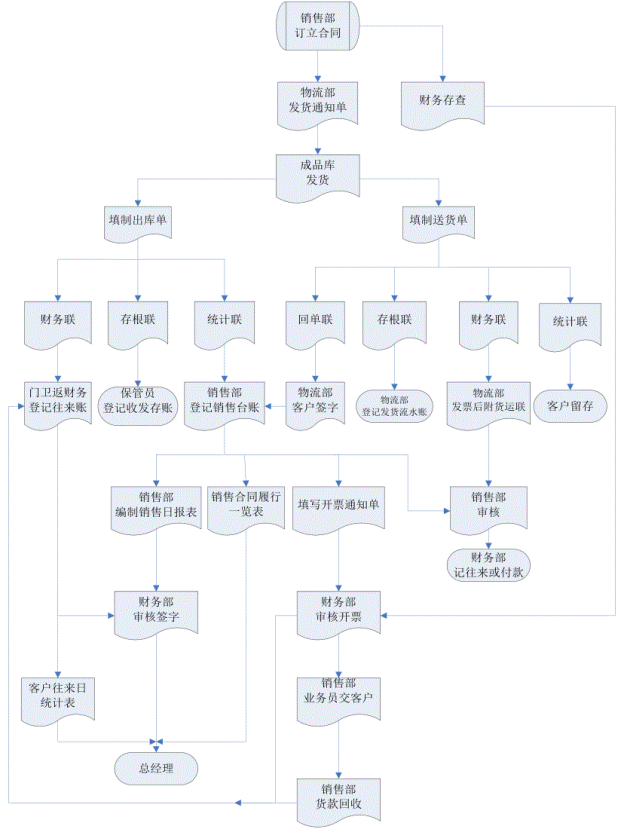 物流部開具《發(fā)貨通知單》通知成品庫保管員發(fā)貨,保管員填制《產(chǎn)品出庫單》(一式三聯(lián))和《產(chǎn)品送貨單》(一式四聯(lián))。《產(chǎn)品出庫單》:保管員依據(jù)存根聯(lián)登記《產(chǎn)品收發(fā)存賬》;統(tǒng)計(jì)聯(lián)交與銷售部,銷售部登記《產(chǎn)品銷售臺賬》;財(cái)務(wù)聯(lián)由物流部或司機(jī)作為出門憑證交與門衛(wèi),門衛(wèi)交與財(cái)務(wù)部,財(cái)務(wù)部登記《客戶往來臺賬》,并根據(jù)《客戶往來臺賬》編制《客戶往來日統(tǒng)計(jì)表》,報(bào)總經(jīng)理。《產(chǎn)品送貨單》:存根聯(lián)交由物流部登記《產(chǎn)品發(fā)貨流水賬》;統(tǒng)計(jì)聯(lián)和回單聯(lián)隨貨同行,統(tǒng)計(jì)聯(lián)交由客戶,回單聯(lián)由客戶簽字后物流部交與銷售部(如客戶不在《產(chǎn)品送貨單》回單聯(lián)上簽字,則應(yīng)取得客戶開具的收貨憑證,并附《產(chǎn)品送貨單》回單聯(lián)后),銷售部據(jù)此登記《產(chǎn)品銷售臺賬》,每日根據(jù)《產(chǎn)品銷售臺賬》編制《產(chǎn)品銷售日報(bào)表》(一式三份,銷售部留底、財(cái)務(wù)部、總經(jīng)理)經(jīng)財(cái)務(wù)部審核后報(bào)總經(jīng)理,每月結(jié)賬日后根據(jù)《產(chǎn)品銷售臺賬》編制《銷售合同履行一覽表》報(bào)總經(jīng)理,根據(jù)《產(chǎn)品銷售臺賬》填制《開票通知單》(一式二份)通知財(cái)務(wù)開具發(fā)票,銷售部通知財(cái)務(wù)開票時(shí),應(yīng)將客戶簽字后的《產(chǎn)品送貨單》回單聯(lián)或客戶的收貨憑證附于《開票通知單》后,開票后應(yīng)在《產(chǎn)品送貨單》回單聯(lián)和客戶的收貨憑證上加蓋“已開票”印章,發(fā)票財(cái)務(wù)記賬后附《開票通知單》入賬,《產(chǎn)品送貨單》回單聯(lián)和客戶收貨憑證附發(fā)票客戶聯(lián)后向客戶結(jié)算,另一份《開票通知單》填寫開票信息后返回銷售部;《產(chǎn)品送貨單》財(cái)務(wù)聯(lián)由物流部保存或交由司機(jī),作為運(yùn)費(fèi)結(jié)算的憑證,附于運(yùn)費(fèi)發(fā)票后結(jié)賬,財(cái)務(wù)審核后應(yīng)在《產(chǎn)品送貨單》財(cái)務(wù)聯(lián)上加蓋“注銷”印章。