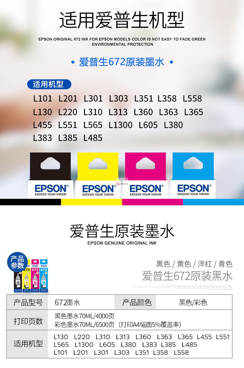 自營愛普生T6721原裝墨水L380 L385 L485 L551 L1300 L360 L220打印機 T672愛普生原裝黃色墨水