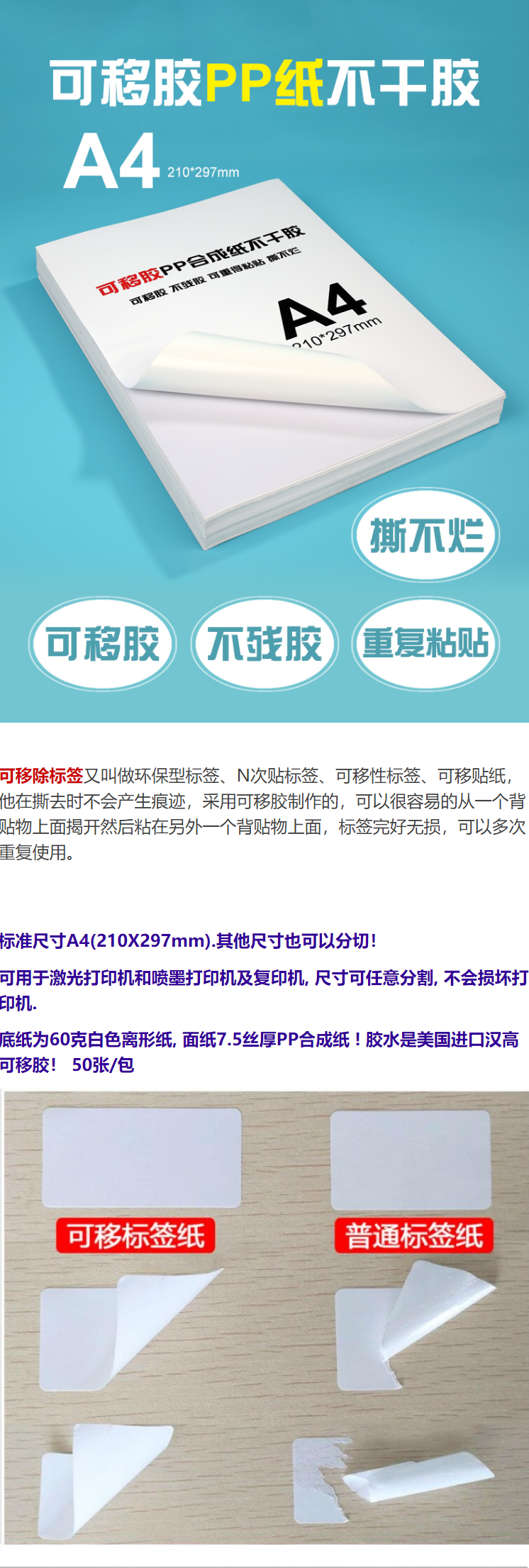商品名稱:A4 亮光 不干膠標(biāo)簽打印紙覆膜背膠粘貼紙 噴墨防水撕不爛耐高溫PET 50張