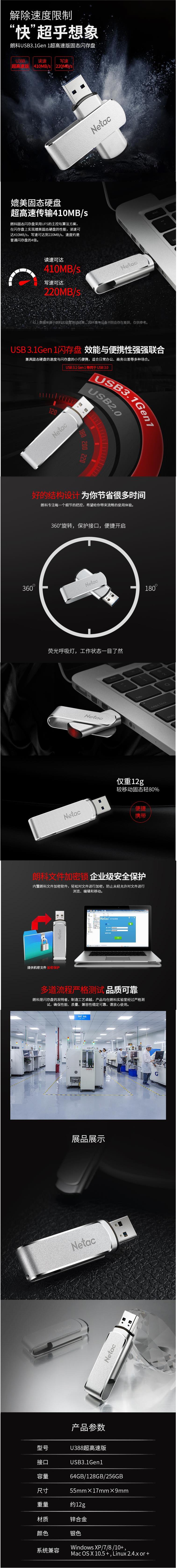 商品名稱:朗科 U388 容量64GB 接口USB3.1 固態(tài)U盤 全金屬 銀色 讀410MB/s 寫220MB/s