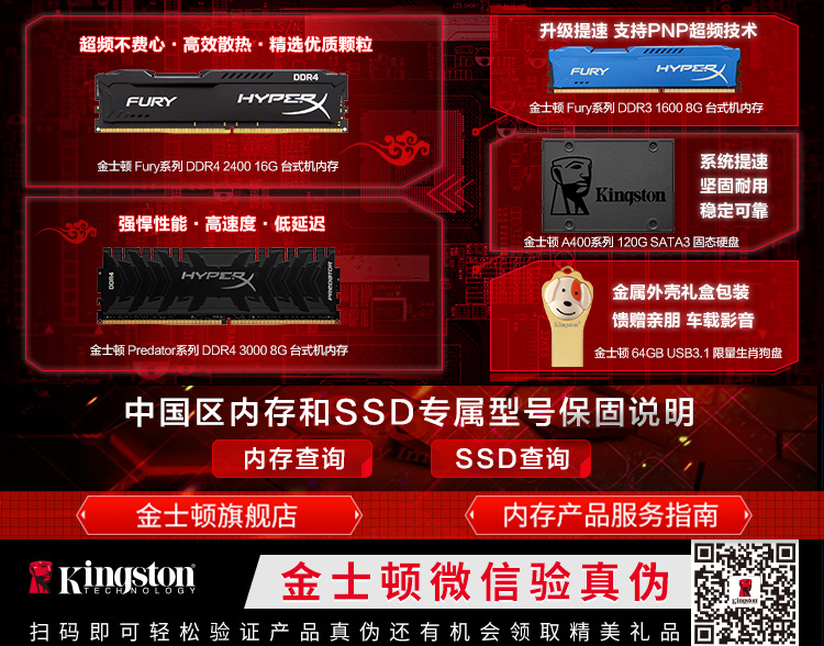 自營金士頓(Kingston)駭客神條 Fury系列 DDR4 2400 16G 臺式機內(nèi)存